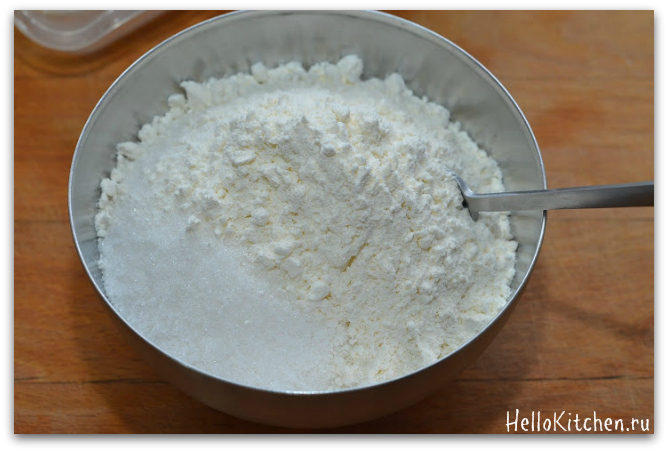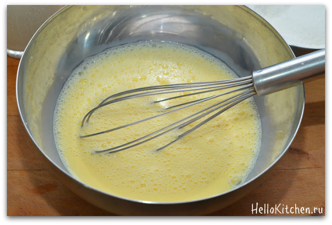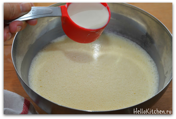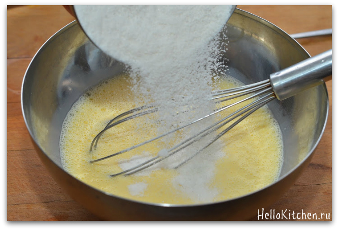 3. Добавляем перемешанный сахар с мукой в молочно-яичную смесь. Очень хорошо перемешиваем, чтобы не было комков.