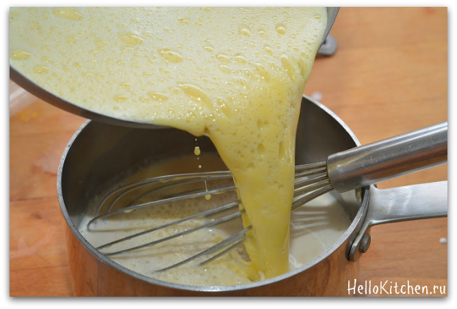 5. Как только молоко начнет закипать — снимите его с огня. И аккуранто влейте 1/3 молока (примерно 60 мл) в молочно-яичную смесь, одновременно перемешивая венчиком.