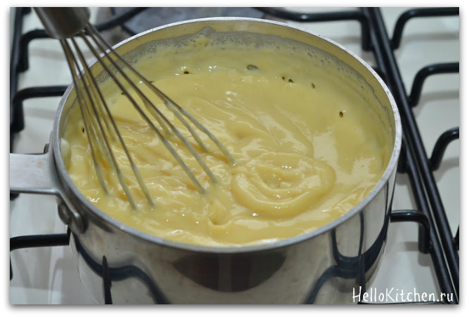 7. Варите на большом огне, пока не загустеет. На определённом этапе крем начнет сворачиваться комочками, пусть вас это не пугает, просто начните активнее помешивать венчиком. Как только крем закипит, дайте ему покипеть буквально 1 минуту и снимите с огня.