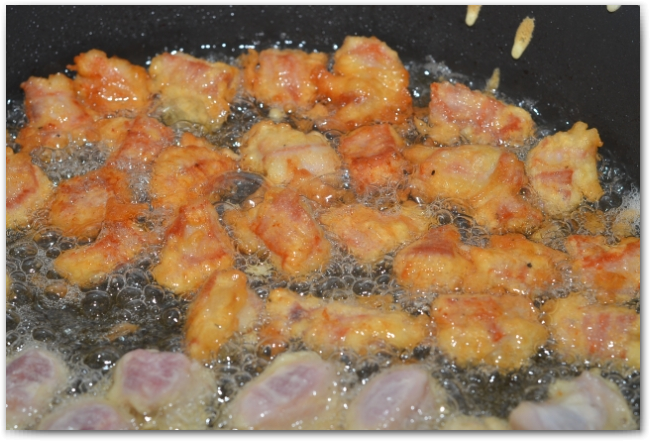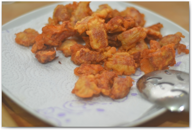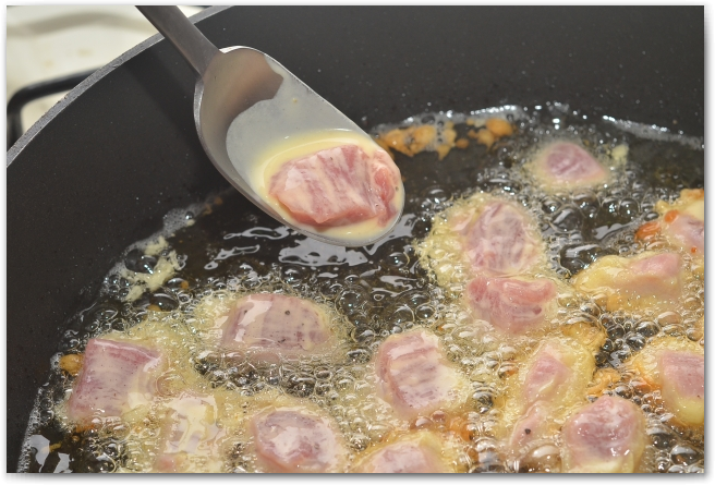 Масло канолы наливается в сковороду, нагревается, и потом в нём уже обжариваются кусочки мяса в кляре. Для этого необязательно использовать именно масло канолы, любое рафинированное масло подойдёт, в том числе и подсолнечное.