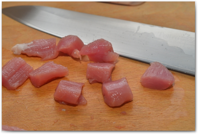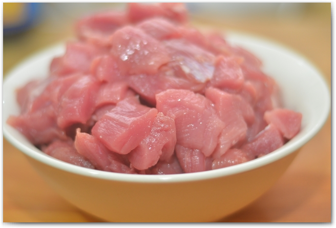 3. А пока займёмся мясом. Нарезаем мясо на кубики, примерно 2х2 см. Удобнее всего нарезать мясо вдоль по волокнам на полоски и потом уже отрезать нужного размера кусочки.