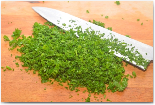 7. Пока овощи в сковороде, нарезаем петрушку, желательно очень мелко.