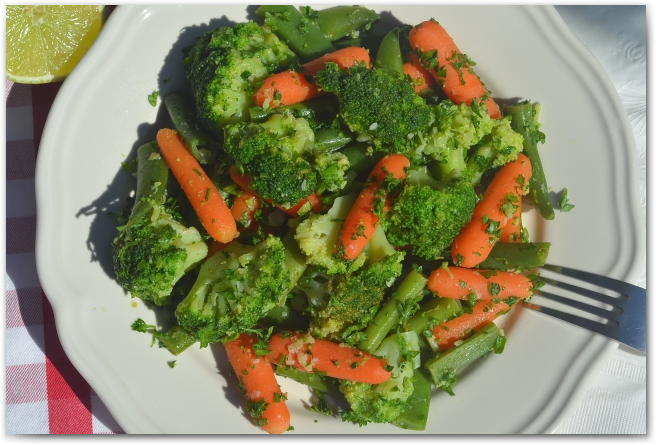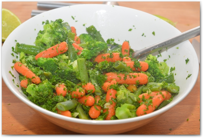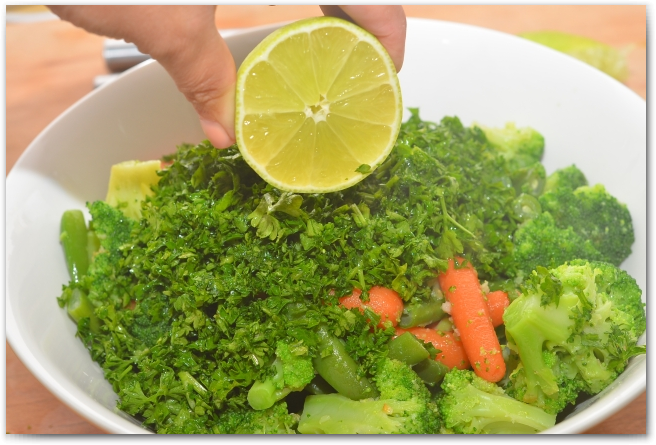 8. Перекладываем овощи в глубокую тарелку, солим, добавляем петрушку и лимонный сок.