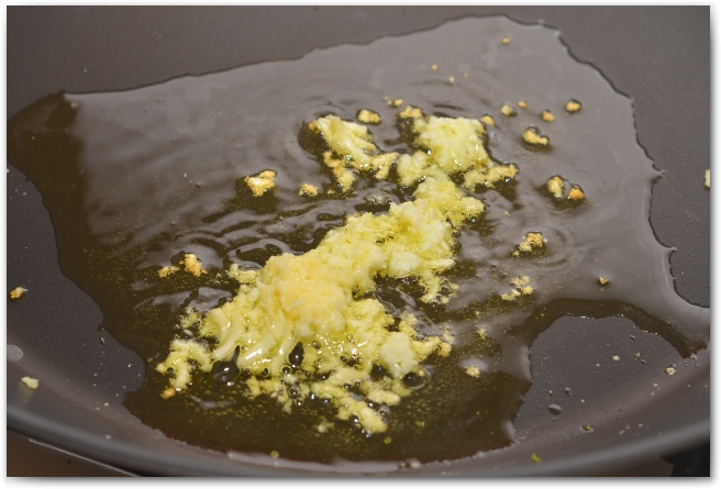 5. Нагреваем масло в сковороде. Выдавливаем в масло чеснок и убавляем огонь до самого маленького.