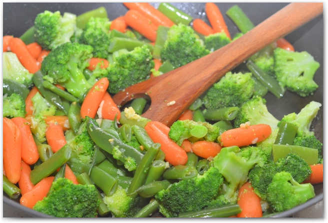 6. Сразу же выкладываем в сковороду овощи и аккуратно перемешиваем. Жарим 2-3 минуты.