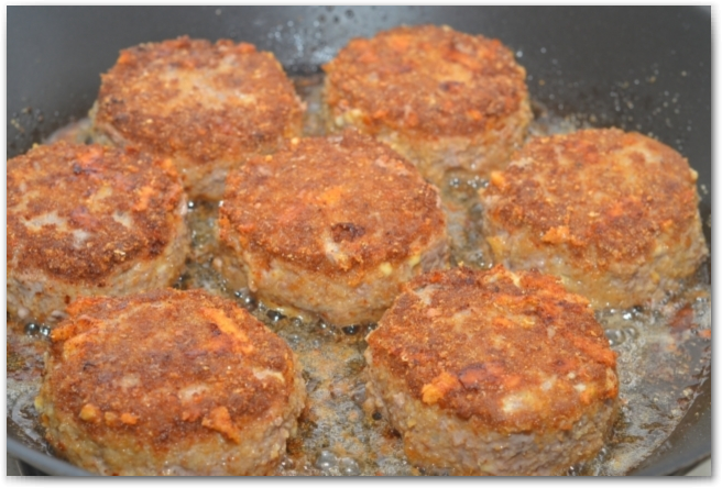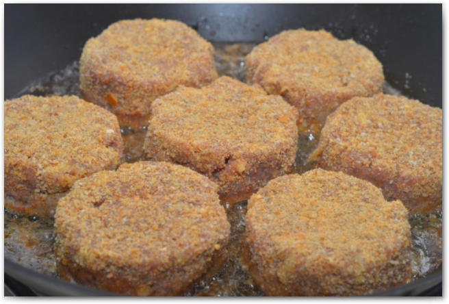 6. Нагреваем масло в сковороде. Обваливаем каждую котлету в сухарях.