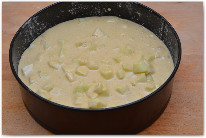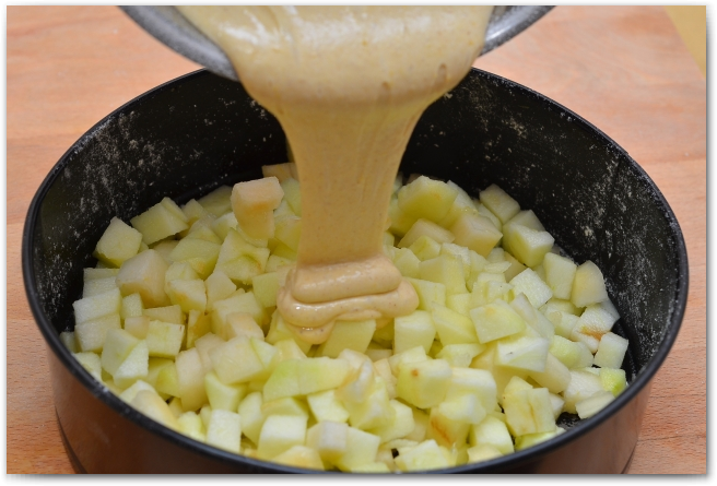 5. Разъемную форму сбрызгиваем растительным маслом и мукой. Форма 22 см в диаметре, 6 см высота. На дно формы выкладываем яблоки и заливаем получившимся тестом.