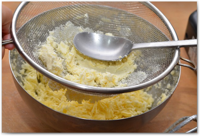 2. Добавляем творог, я протирала творог через сито, так как он был очень плотный, если у вас крупчатый творог, его так же надо протереть через сито.