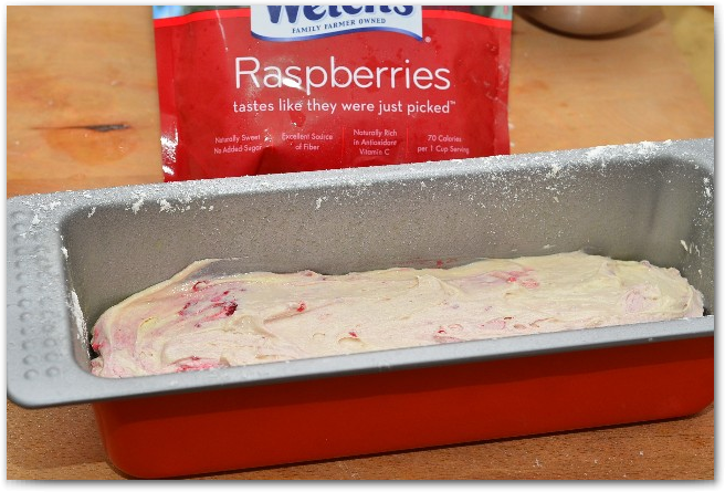 8. Аккуратно добавляем малину, лучше, чтобы она была хорошо заморожена, чтобы не потёк сок. Очень аккуратно перемешиваем. Смазываем форму для кекса маслом и присыпаем её мукой. Выкладываем тесто в форму, выпекаем кекс 50-60 минут.