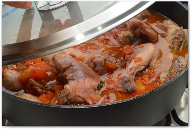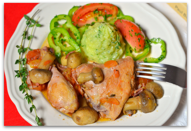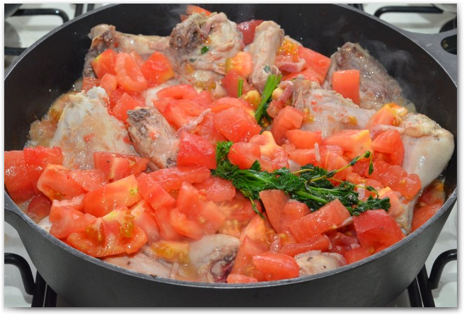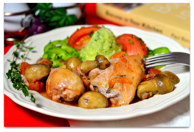 Этот замечательный рецепт я нашла опять же в книге Поля Бокюза, и оригинал рецепта называется «Кролик по-лионски», но так как я уже говорила, кролика не ем, заменила его окорочками совсем юных цыплят. Рецепт очень простой и время приготовления занимает всего один час. Результат: отличное домашнее второе блюдо, очень нежное куриное мясо в ароматнейшем томатном соусе.