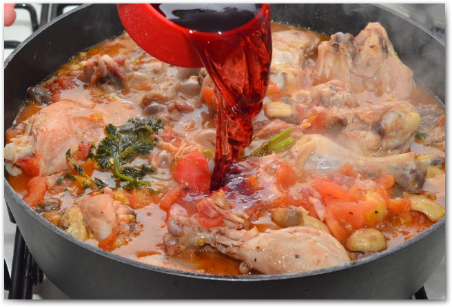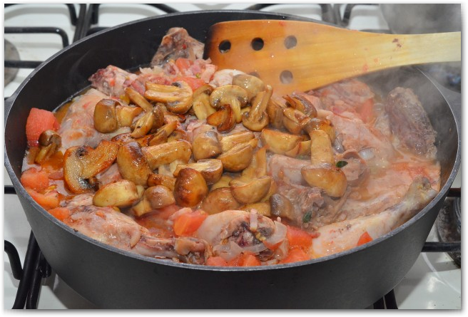 13. Когда 25 минут тушения закончатся, добавляем вино, хорошо перемешиваем. Пробуем на соль и перц.