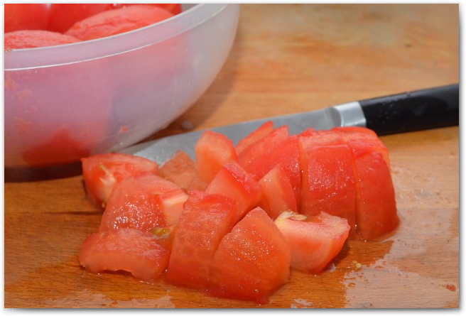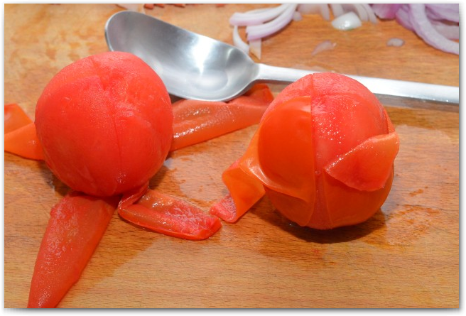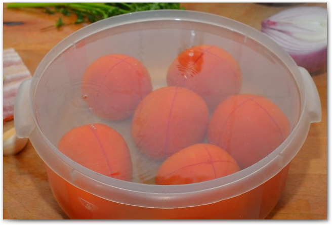 1. Чистим помидоры. Делаем крестообразные надрезы на помидорах и заливаем их кипятком на несколько минут.
