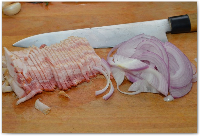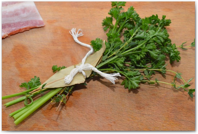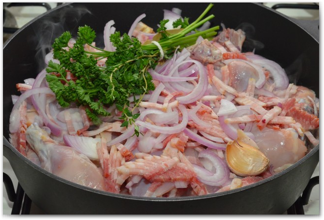 7. Выкладываем туда окорочка, предварительно разрезав их пополам (если у вас кролик, разрежте его примерно на 10 кусочков). Туда же кладём лук, бекон, чеснок и букет гарни. Жарим на большом огне около 10ти минут, пока мясо хорошенько не подрумянится. Часто перемешиваем.
