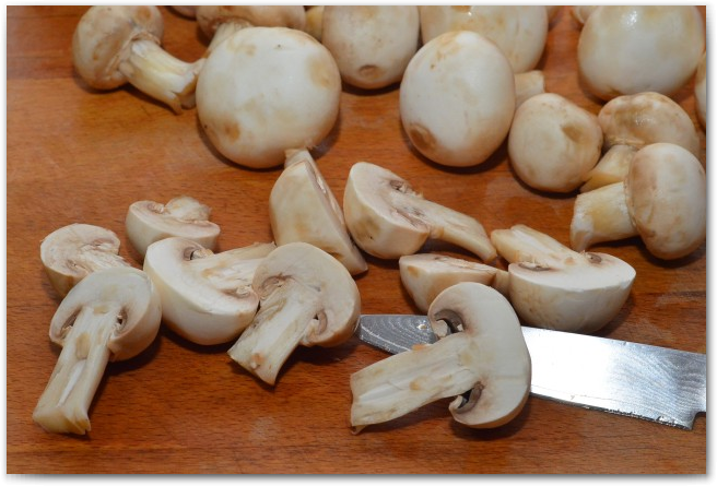 9. Пока мясо тушится, займёмся грибочками. Моем и нарезаем их пополам.