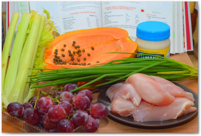 Листая свой любимый учебник по кулинарии «On Cooking», случайно наткнулась на рецепт этого салата (стр.886). Внимательно изучив все ингредиенты, мысленно смешав это всё в воображении, мне показалось, что это должно быть невероятно вкусно. Решено было приготовить его на следующий же день. И я не ошиблась, салат оказался действительно очень вкусным, даже лучше! Сочетание куриного филе и фруктов не может оставить равнодушным никого. Я лишь заменила манго на папайю, которую в свою очередь можно заменить на дыню или сладкую мягкую грушу, или на любой другой мягкий сладкий фрукт.