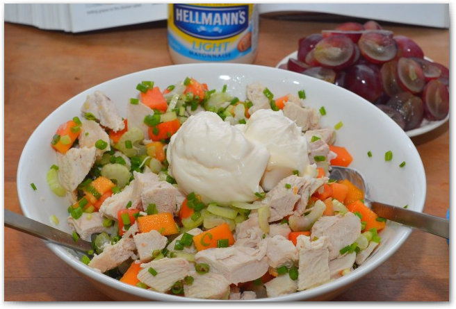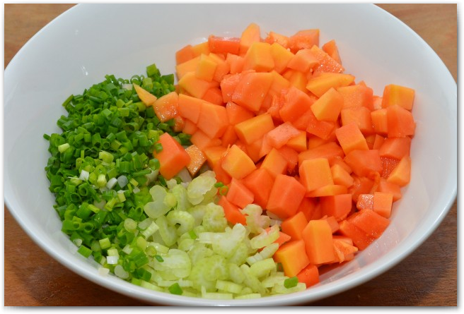 9. Аккуратно смешиваем лук, сельдерей, папайю. Добавляем майонез и хорошенько перемешиваем снова. Я покупала лёгкий майонез, обычный, на мой взгляд, будет тяжеловат.