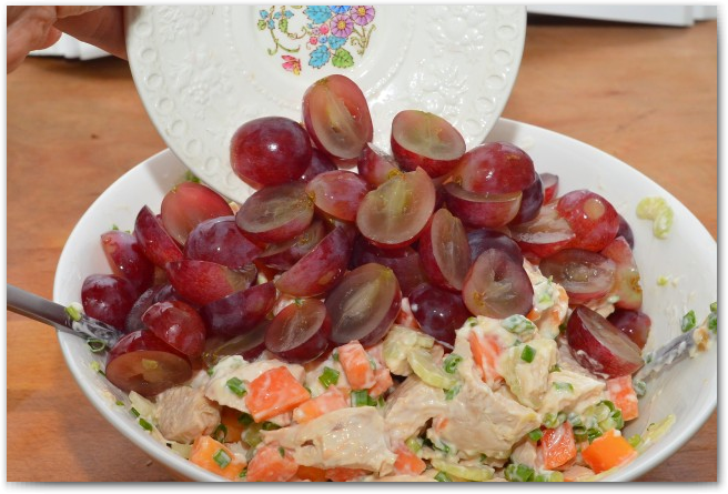 10. В самом конце добавляем виноград, аккуратно перемешав салат окончательно.