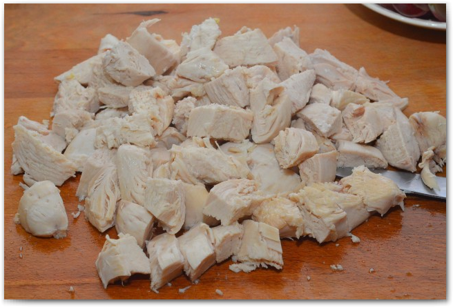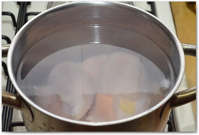 1. Ставим вариться куриное филе. Заливаем его холодной водой, солим, ставим на большой огонь. Филе будет готово примерно через 20 минут, после того как закипит вода. Готовое филе выкладываем остужаться.