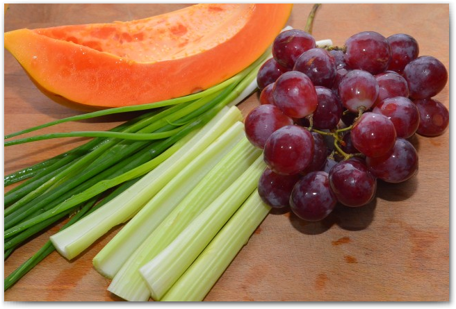 2. Моем лук, сельдерей, виноград и чистим папайю от косточек и шкурки.