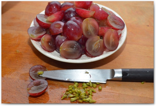 7. Виноград разрезаем пополам и удаляем косточки (если есть) острым ножом. Складываем виноград отдельно.