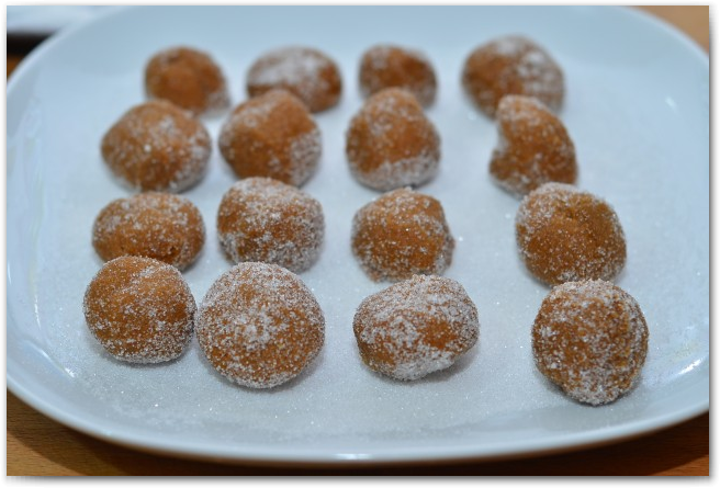 10. Каждую маленькую часть скатываем в шарик и обваливаем в сахаре. Пока делаем шарики, лучше всего, чтобы остальное тесто ждало своего часа в холодильнике.