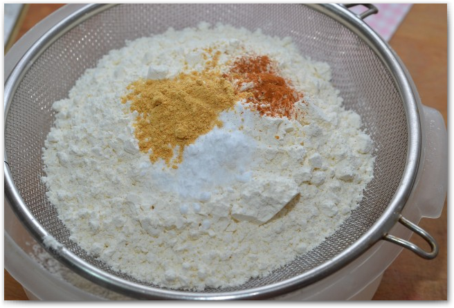 5. В отдельную миску просеиваем муку, соду, имбирь, корицу, чесночный порошок и кардамон.