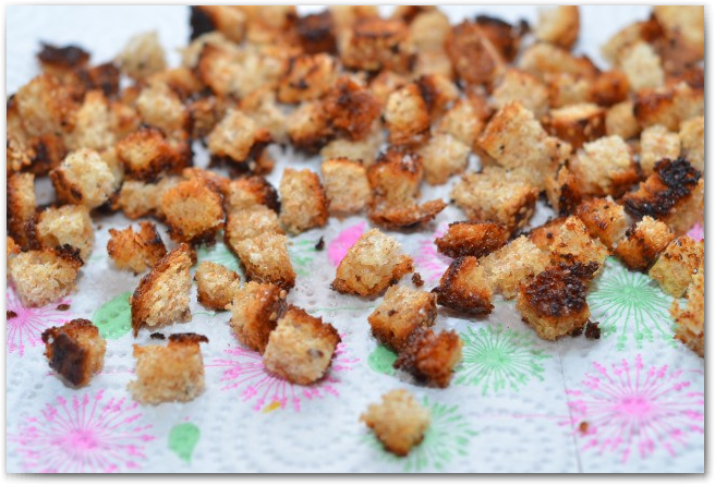 9. Нарезаем хлеб кубиками, обжариваем на растительном масле до золотистого цвета. Перекладываем на бумажное полотенце. Солим, перчим.