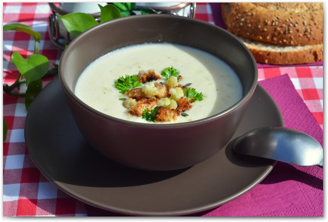 10. Всё! Королевский крем-суп из цветной капусты готов. При подаче посыпаем гренками, отварными маленькими соцветиями капусты и зеленью. У этого супа богатый, но нежный молочный вкус, и он совсем не жирный, как многие подобные супы, так как молоко можно использовать любой жирности, у меня было 1,5 %. Так как готовить такой суп всего пол часа , а результат просто великолепный, думаю вернусь к нему ещё не раз.