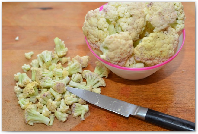 1. Разбираем капусту на соцветия. У нас должно получиться 300 гр крупных и около 50 гр (3/4 чашки) мелких. Мелкие убираем в сторону.