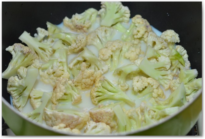 2. Выкладываем капусту в кастрюлю с широким дном, наливаем туда 1/2 чашки воды + 1/2 молока. Ставим на огонь, даём закипеть, накрываем крышкой, убавляем огонь на самый маленький и варим около 7ми минут или пока не станет мягкая.
