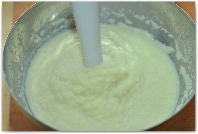 3. Из готовой капусты и жидкости, в которой она варилась, делаем пюре, я использовала ручной блендер, можно использовать и обычный. Отставляем в сторону.