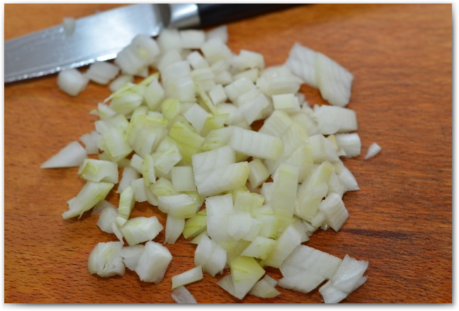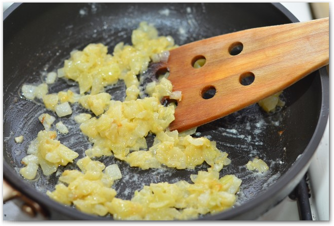 5. В небольшой сковороде на среднем огне растапливаем масло, добавляем лук, накрываем крышкой, убавляем огонь до минимума, жарим 5 минут, пока лук не станет мягкий и прозрачный, но не зажаренный.