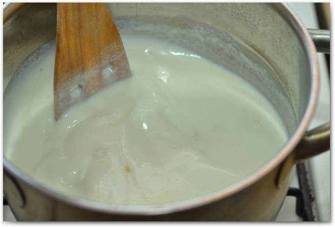 7. Добавляем ру в молоко и хорошо перемешиваем, чтобы не было комков, затем доводим молоко до кипения, добавляем туда пюре из капусты, снова доводим до кипения, солим, перчим свежемолотым перцем. Снимаем с огня.