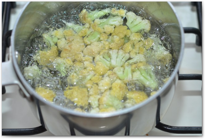 8. Теперь займёмся гарниром. Кидаем в кипящую подсоленную воду мелкие соцветия капусты, варим 2 минуты или пока не станут мягкие, сливаем воду, убираем в сторону.