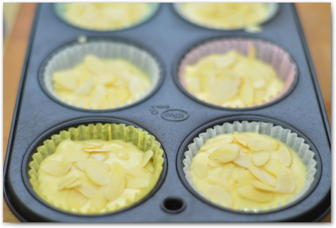 8. Наполняем формочки получившимся тестом на две трети. Посыпаем миндальными лепестками, слегка придавливая их. Совсем слегка. Отправляем будущие маффины в разогретую духовку на 25 минут.