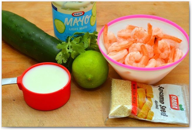 11. Теперь осталось только красиво выложить салат на тарелочку. Все ингредиенты должны быть охлаждены в холодильнике. Посередине горкой выкладываем креветки, вокруг креветок поливаем соусом, на соус выкладываем огурчики, украшаем всё листиками кориандра. Наслаждаемся!