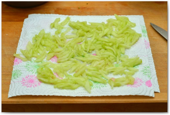 8. Сливаем воду, которую пустили огруцы, постояв с солью. Огурцы получились совсем как малосольные — хрустящие и солёные. Убираем излишнюю воду с огурцов с помощью бумажных полотенец.