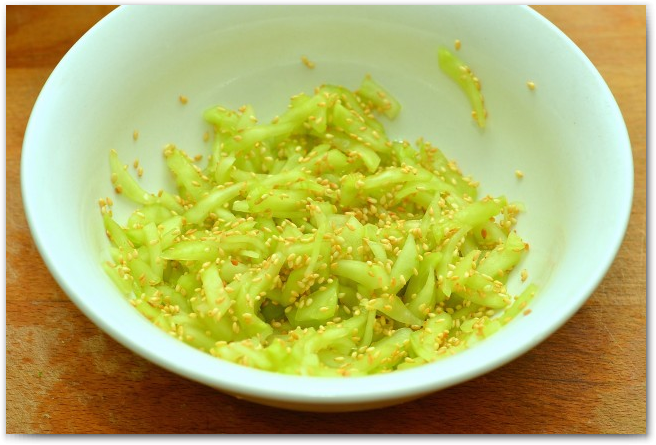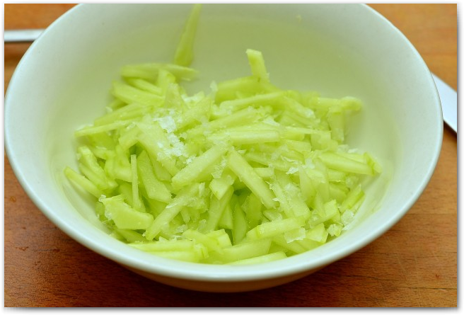3. Перекладываем нарезаные огурцы в тарелочку, обильно солим морской солью, хорошо перемешиваем и убираем в сторону.