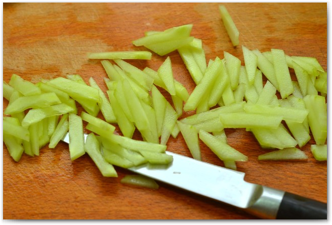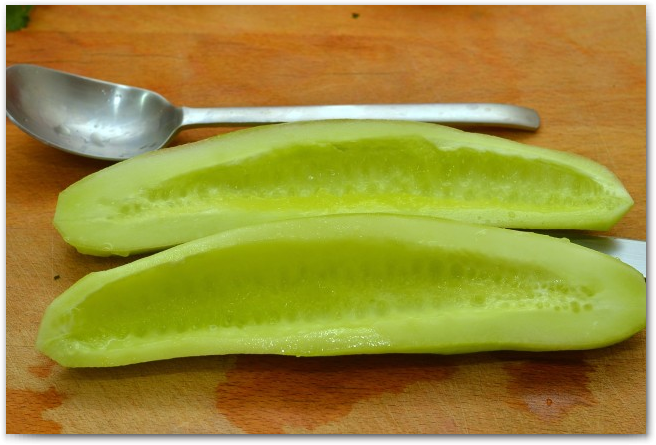 1. Очищаем огурец от кожуры. Столовой ложкой удаляем семена.