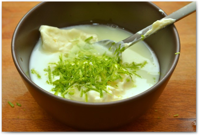 6. Делаем соус. Смешиваем йогурт, майонез, сок и цедру лайма.
