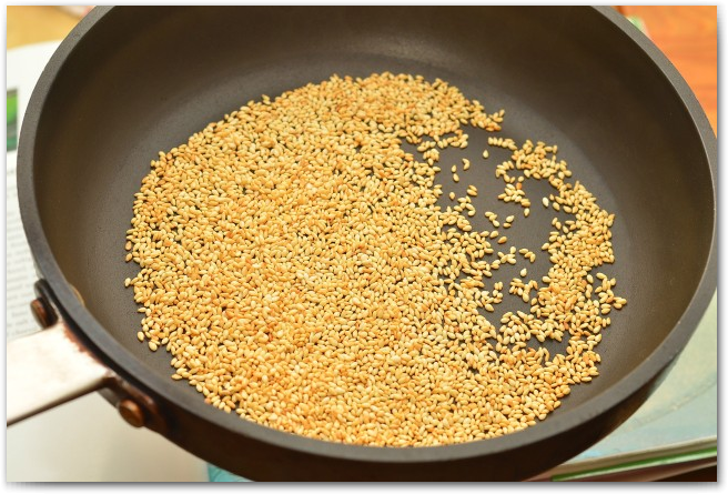 9. На небольшой сковороде, на сильном огне, обжариваем кунжут, буквально пару минут. Следим, чтобы он не подгорел, а только красиво зарумянился.