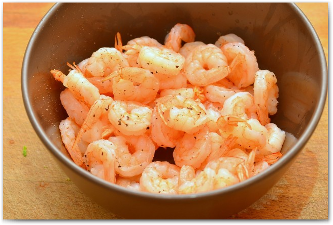 4. Варим креветки. В кипящую солёную воду кидаем креветки, ждём пока закипит (примерно минуту), и откидываем их на друшлаг. Очищаем от хвостиков, перчим свежемолотым перцем, солим, если надо, хорошо перемешиваем и убираем в холодильник.