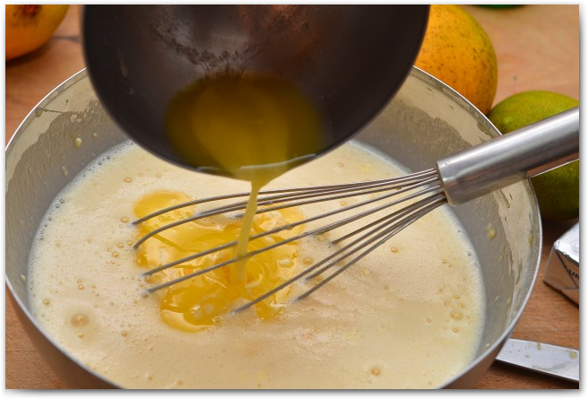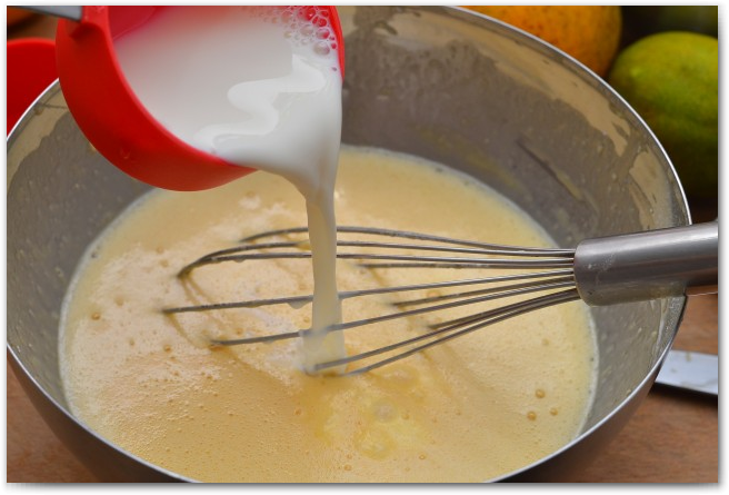 2. Постепенно добавяляем молоко и сливки. Хорошо перемешиваем.