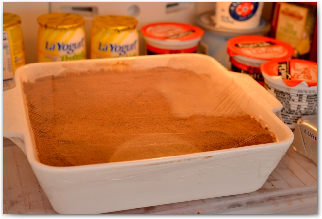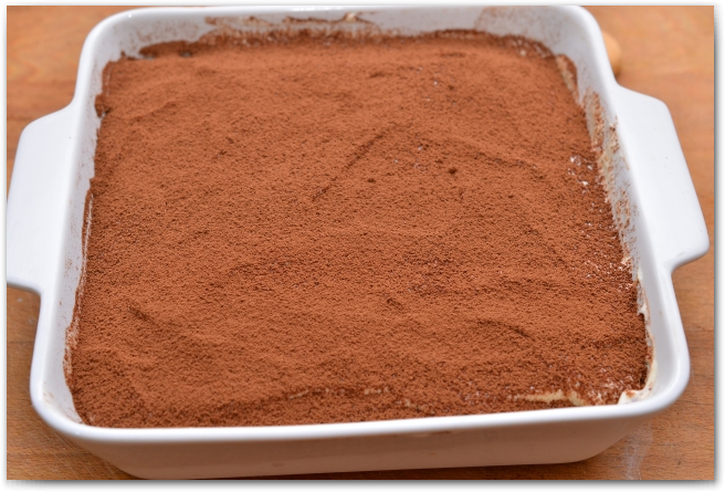 14. Смазываем этот слой савоярди оставшимся кремом. И с помощью ситечка, посыпаем какао-порошком.