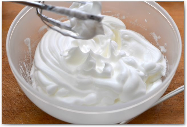 4. Взбиваем белки с половиной сахара до жёстких пиков. Примерно 5-6 минут на самой маленькой скорости миксера. Белки взбиваются лучше, если они комнатной температуры. Желтки же наоброт, должны быть охлаждённые.