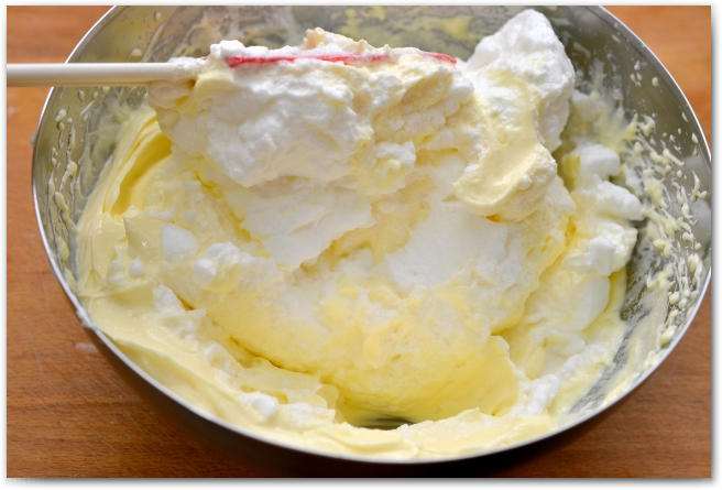 8. Соединяем белки с сырной массой, деревянной ложкой или силиконовой лопаткой. Аккуратными медленными движениями снизу вверх. Работаем очень аккуратно и медленно, чтобы масса не опала.