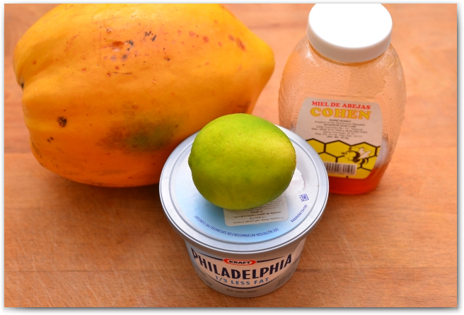 1. Очищаем папайю от косточек и кожуры, нарезаем кубиками и отправляем в блендер. У меня ручной, но обычным будет удобнее. Очень важно, чтобы папайя была очень спелая и сладкая, тоже самое касается и других фруктов. Тогде не прийдётся добавлять много мёда.