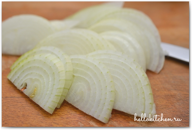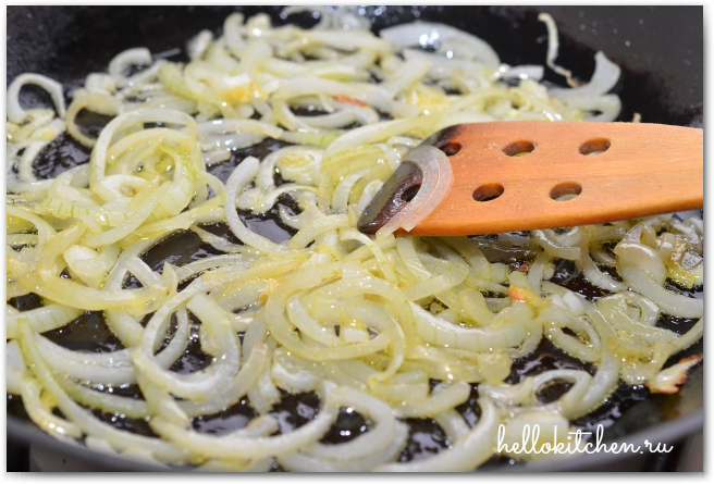 5. Разогреваем оливковое маслов сковороде, выкладываем лук и обжариваем, пока лук не станет мягкий и прозрачный, НЕ зажариваем до золотистого цвета!