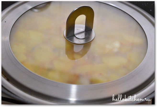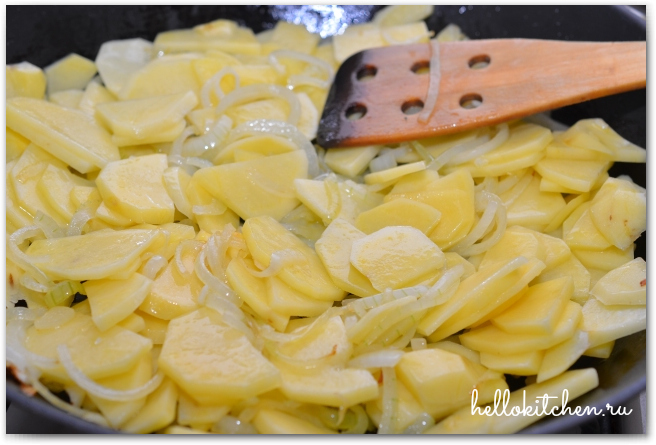 6. Как только лук стал мягкий, выкладываем картофель, хорошо перемешиваем и жарим до готовности примерно 10-15 минут. В течении жарки помешиваем картошку, чтобы она не зажаривалась.