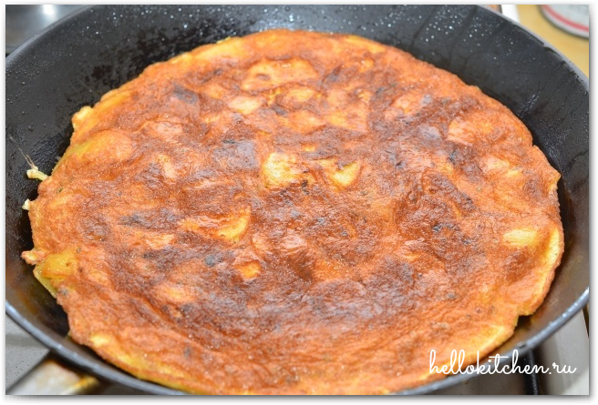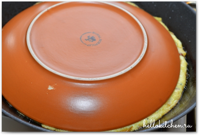 16. Затем выкладываем омлет из тарелки обратно в сковороду, омлет должен как бы соскользнуть из тарелки в сковороду. Жарим уже без крышки ещё 2-3 минуты.